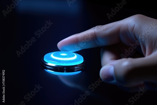 Finger presses the blue button. Press the button.