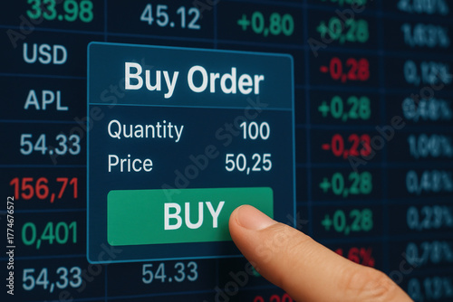 Finger pressing a digital “Buy” button on a stock trading interface displaying a buy order with quantity and price details