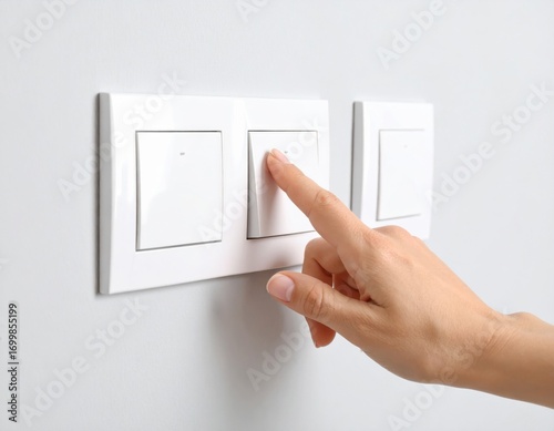 Finger pressing white light switch on clean wall to turn on or off electrical lighting in modern home interior.