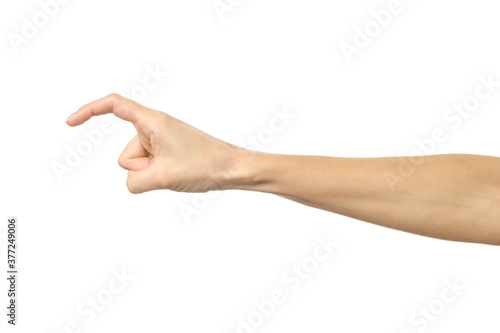 Finger reaching or scratching. Woman hand gesturing isolated on white