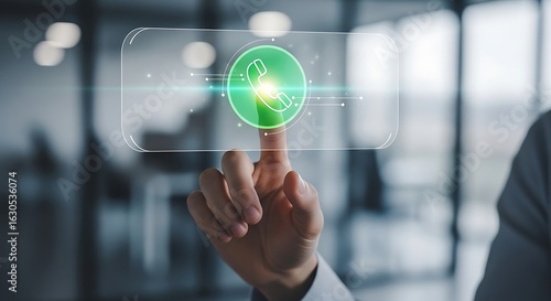 Finger Touching a Glowing Phone Icon on an Abstract Digital Display