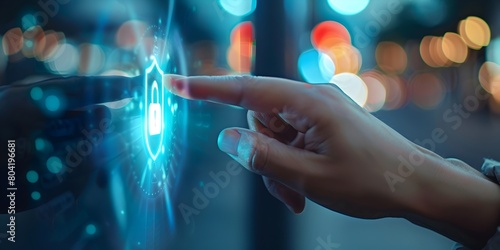 Finger Touching Digital Shield Button on Touchscreen Interface for Secure Modern Electronic Access