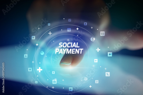 Finger touching tablet with social media icons and SOCIAL PAYMENT