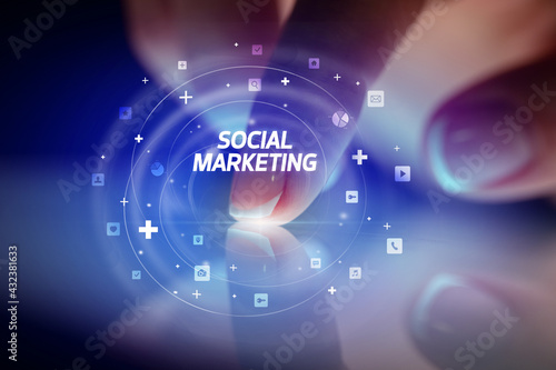 Finger touching tablet with social media icons concept