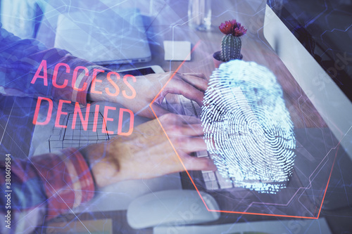 Fingerprint hologram with businessman working on computer on background. Security concept. Double exposure.