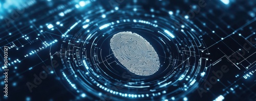 Fingerprint on a touchscreen surrounded by digital data swirls, Biometric authentication, Modern technology interface