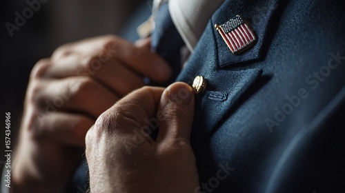 Fingers adjusting flag on collar, soft light