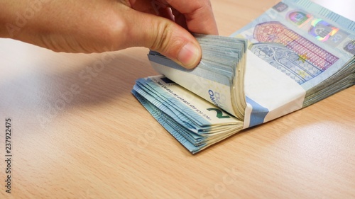 FIngers countig a stack of twenty Euro notes on a pine desk