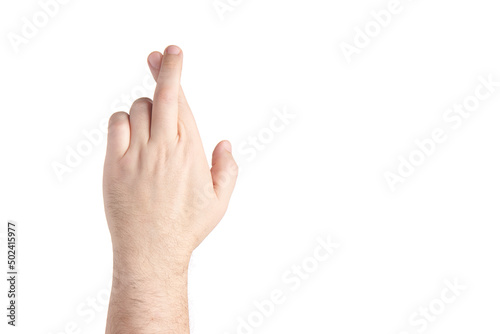 Fingers crossed isolated on white background. Brutal man's palm showing fingers crossed gesture. Finger gestures. Copy space.