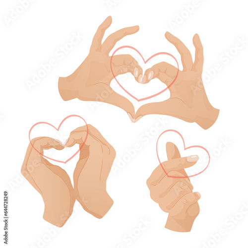 Fingers folded in shape of heart vector illustrations set. Woman making heart gestures in different ways, showing love and affection with hands. Valentine day, romance, support concept