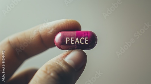 Fingers holding a color mini pill with text "PEACE"on a soft background.