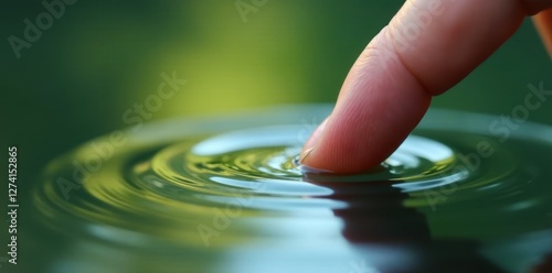 Fingertip dips into cool pond water, ripples spread , peace, nature photography