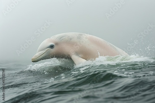 finless porpoise bursting through water under bleached sky, in hyperrealistic style, blending modern with mystical elements in pink and yellow tones.
