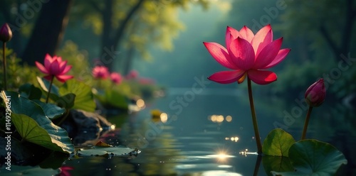 Fiore rosso su un fiore sul fiume con sfondo un tempio indiano di notte, flora, vegetali