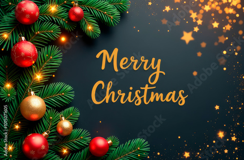 Fir branches, red and gold balls and stars on a black background. Inscription Merry Christmas. Postcard, greeting