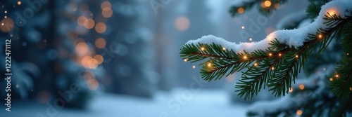 Fir branches with snow and glowing lights in the background, , winter landscape, christmas lights