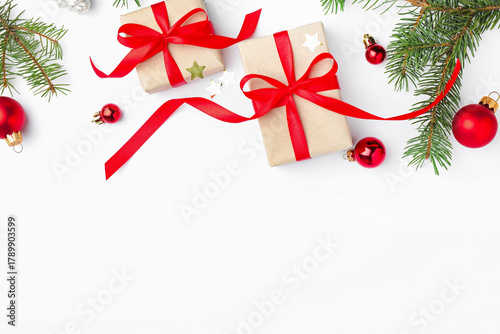 Fir tree branches, gift boxes and Christmas decor on white background, flat lay. Space for text