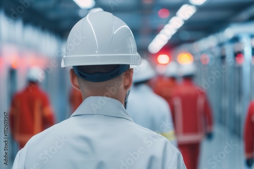Fire alarms trigger evacuation response. Worker in safety gear in industrial corridor