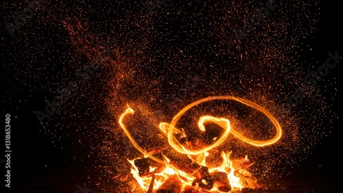 Fire igniting with sparks flying against dark background Represents nature, warmth, energy, outdoor bonding