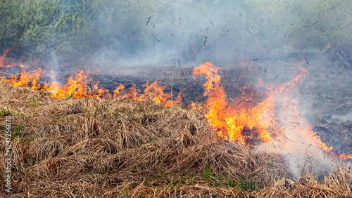 fire in dry grass in an open area, bright flames engulf the field, smoke rises, natural disaster and environmental threat