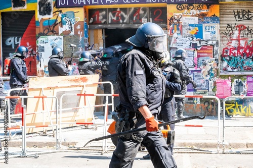 Fire protection test in the Rigaer STrasse 94 in Berlin on the 17 July 2021. The police tried to get into the house with a fire protection expert.