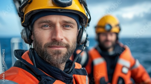 Fire safety training exercise for cargo vessel crew in protective uniform practicing emergency response and rescue procedures on the ship s deck near the water s edge