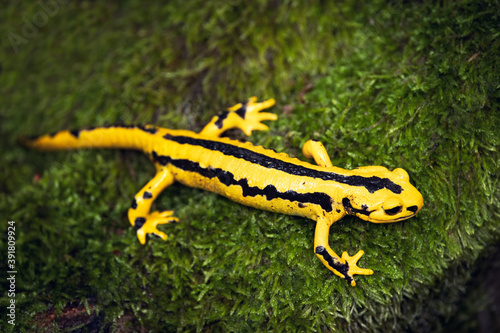 Fire salamander (Salamandra salamandra) is the best known salamander, with its black spots on yellow body. Fire salamanders live in forest of Central Europe and hilly areas, ponds or brooks.