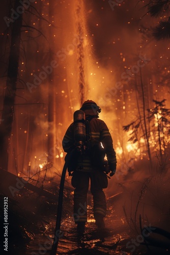 Firefighter battling a forest wildfire with hose spraying water in intense blaze