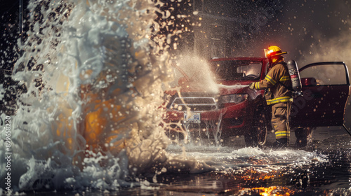 Firefighter Combats Flames From Red Vehicle During Intense Fire Suppression Effort