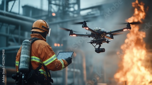 Firefighter deploying a high-tech drone for industrial fire surveillance, futuristic safety technology, clean commercial presentation.