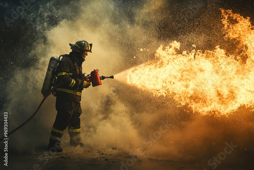 Firefighter Fighting Fire with Water Hose and Smoke