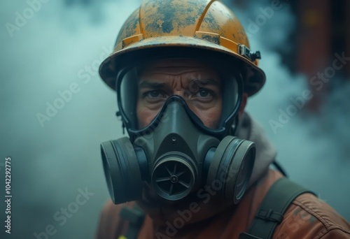 Firefighter with gas mask and helmet surrounded by smoke in burning building, close up