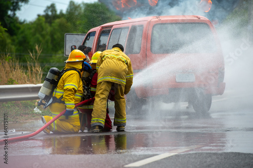 Firefighters are spraying high-pressure water to extinguish a fire caused by a car crash.