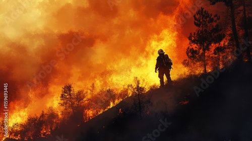 Firefighters, smoke, and flames in the forest for emergency situations, disaster relief, and bush damage control. Mountain, volunteer work, fire rescue assistance, and bravery.