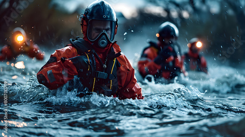 Firefighters wearing oxygen masks and red jumpsuits crossing a river, emergency action plan