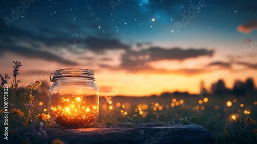 Firefly lights in glass jar at sunset.