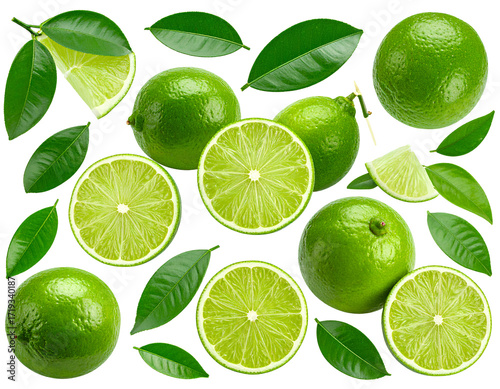 Firefly_Fresh Limes and Green Leaves Scattered citrus fruit isolated on a transparent backgro