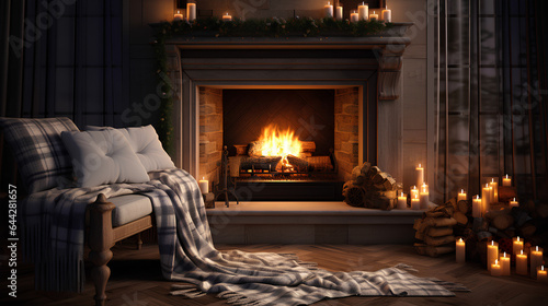 fireplace inside the house, with a simple bedspread on the floor, garlands
