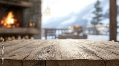 Fireplace, Rustic Table, Cozy Winter Scene, Warm Fire, Wooden Surface, Winter Cabin, Mountain View, Blurred Background