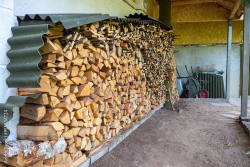 Firewood warehouse. Chopped wood for kindling fireplace. Stack of firewood lies along wall. Warehouse of lumber for stove. Firewood for kindling under shed. Woods supplies for winter