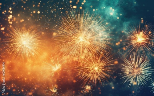 Fireworks at New Year, Sparklers and bokeh lights on sky, Banner design, Copy space for text (Generative AI)