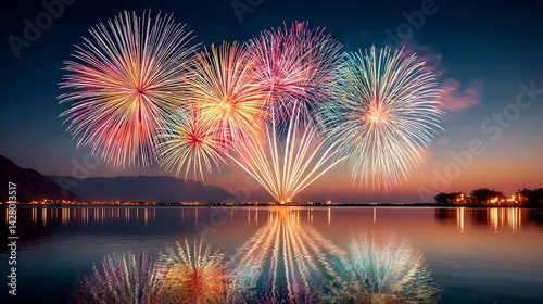 Fireworks display is lit up in the night sky over a body of water. The fireworks are in various colors and are scattered throughout the sky. The scene is peaceful and serene