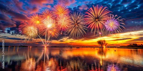 Fireworks Display over Sunset Lake, Reflection, Celebration, Festive, Night Sky