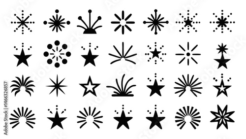 Fireworks line icon set featuring a range of burst patterns including star, spiral, fountain, and rocket designs perfect for festive and celebratory themes