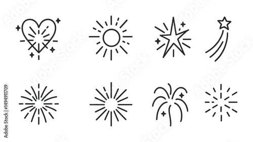 Fireworks outline icons set – silhouette, linear, celebration and festive graphics