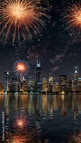 Fireworks over a city skyline and water reflections