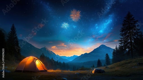 Fireworks over forest, tent silhouettes, camping scene