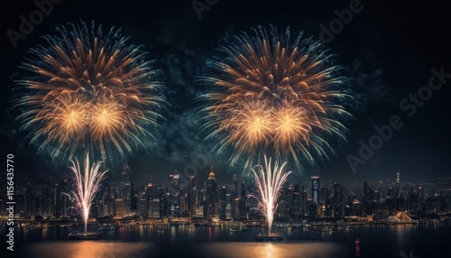 Fireworks reflecting on a river at night during a celebration in the city with colorful lights and a festive atmosphere, 2025