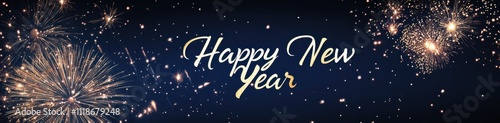 Fireworks text "Happy New Year" on a dark blue background, with a glittering gold and silver firework circular ring decoration, a starry night sky Generative AI