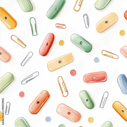First Day Back to School Supplies. Colorful stationery items arranged in a playful pattern.